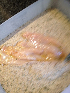First I trim all the fatty/ugly parts of the chicken. Even though I buy thinly sliced breasts I always pound out my cutlets so that they are really thin. I do not like thick cutlets. I put them in a ziploc bag and pound away. This is a great stress reliever too!